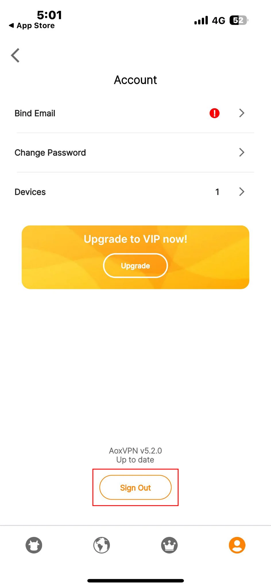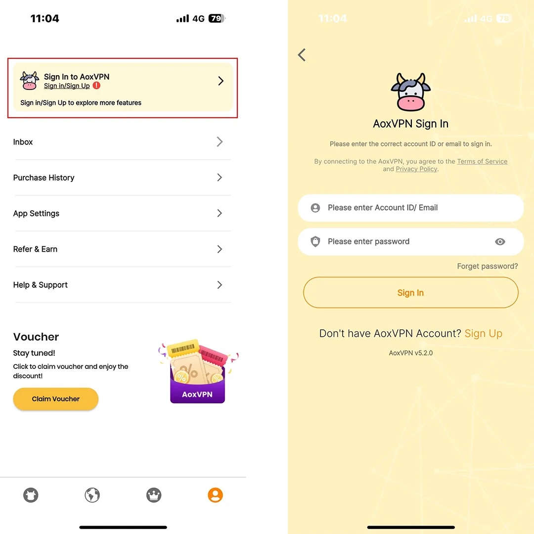 Go to the AoxVPN app on your device and go to account page to view your Account ID. This Account ID is different from your website Account ID. Tap the account details banner to enter account setting page.
