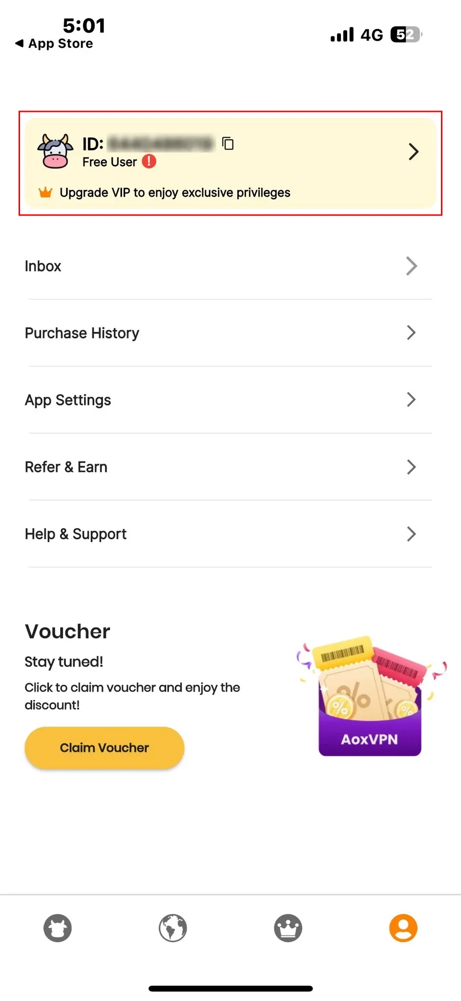 Go to the AoxVPN app on your device and go to account page to view your Account ID. This Account ID is different from your website Account ID. Tap the account details banner to enter account setting page.