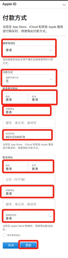 此时您已经进入到付款方式页面,请按照下述描述填写相关信息:国家或地区:香港。付款方式:无。帐单寄送地址:姓氏,名字,街道地址可以随意填写。电话号码:852 + 任意 8 位数字。配送地址:姓氏,名字,街道地址可以随意填写,国家或地区选择香港。填写完毕后,最后点击最底部的 “更新” 按钮即可。 若付款方式无法选择 “无”,请使用其他方式下载。
